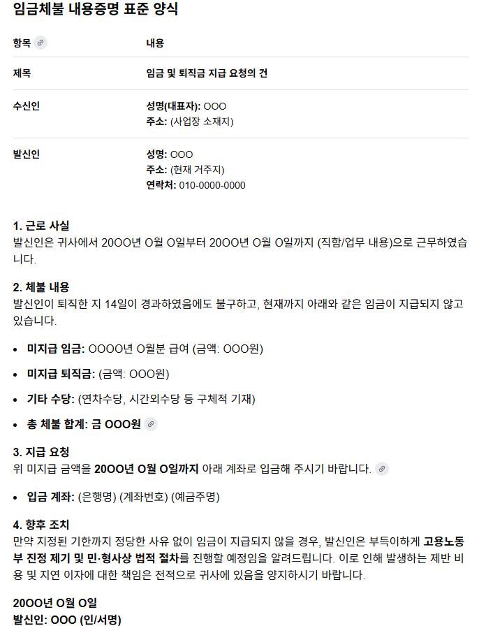 회사에서 지급을 계속 미루는 경우 내용증명을 보내 공식적으로 요청할 수 있습니다. 양식은 위와 유사하게 작성하면 됩니다.