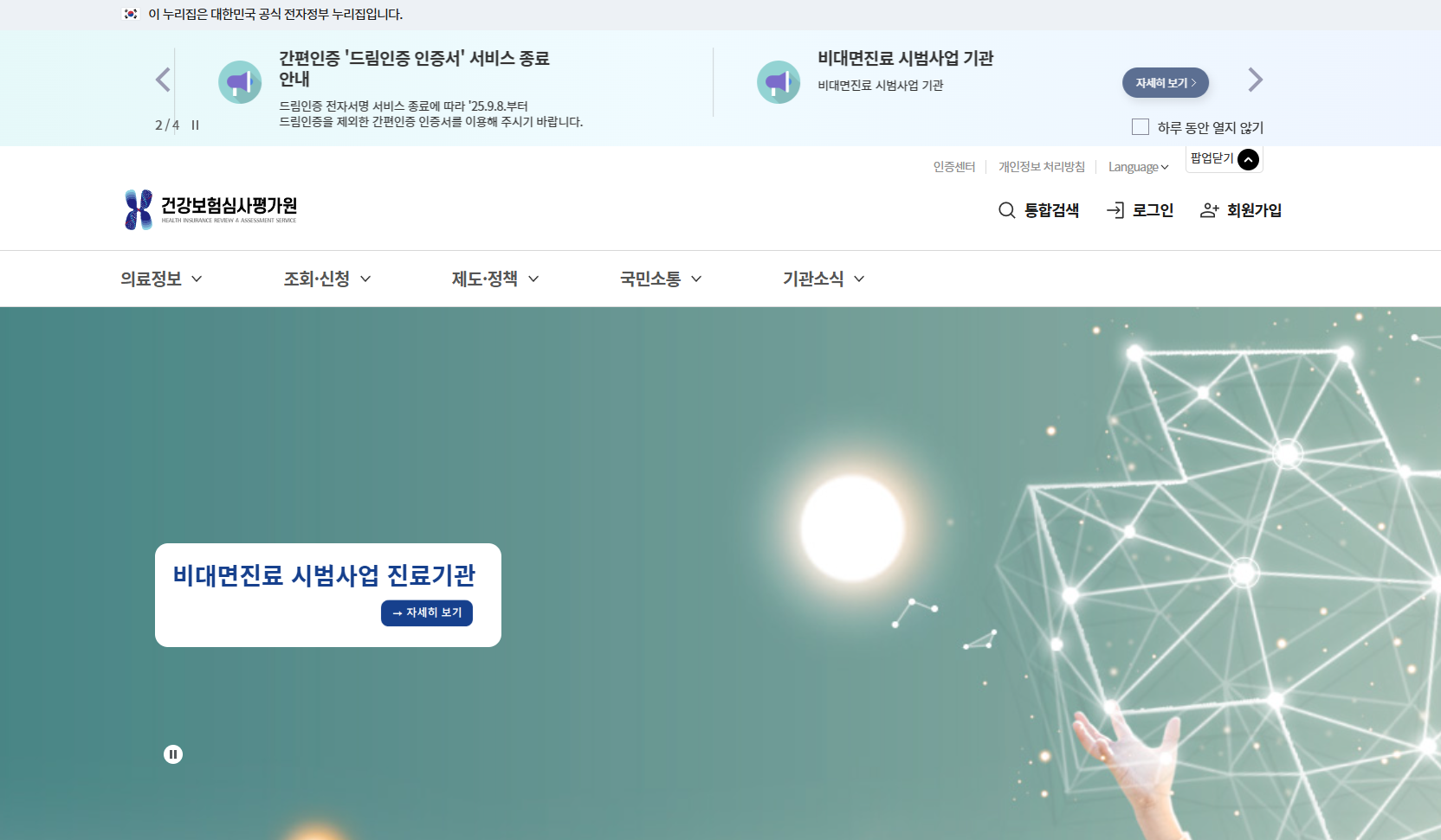 건강보험 심사평가원 홈페이지 로딩중 SCROLL DOWN 다양한 의료정보 서비스를 이용하세요. 요양기관업무포털 요양기관 업무포털시스템은 진료비 청구와 관련된 각종 정보 제공과 심사진행과정 및