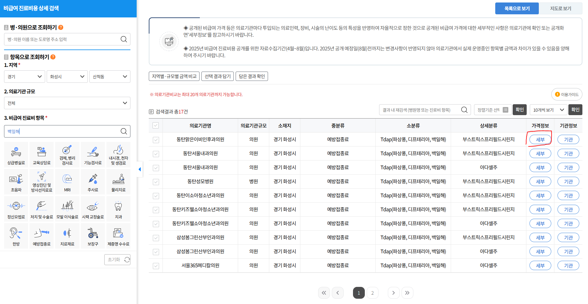 제가 살고 있는 지역의 백일해를 접종할수 있는 병원내역이 나옵니다.