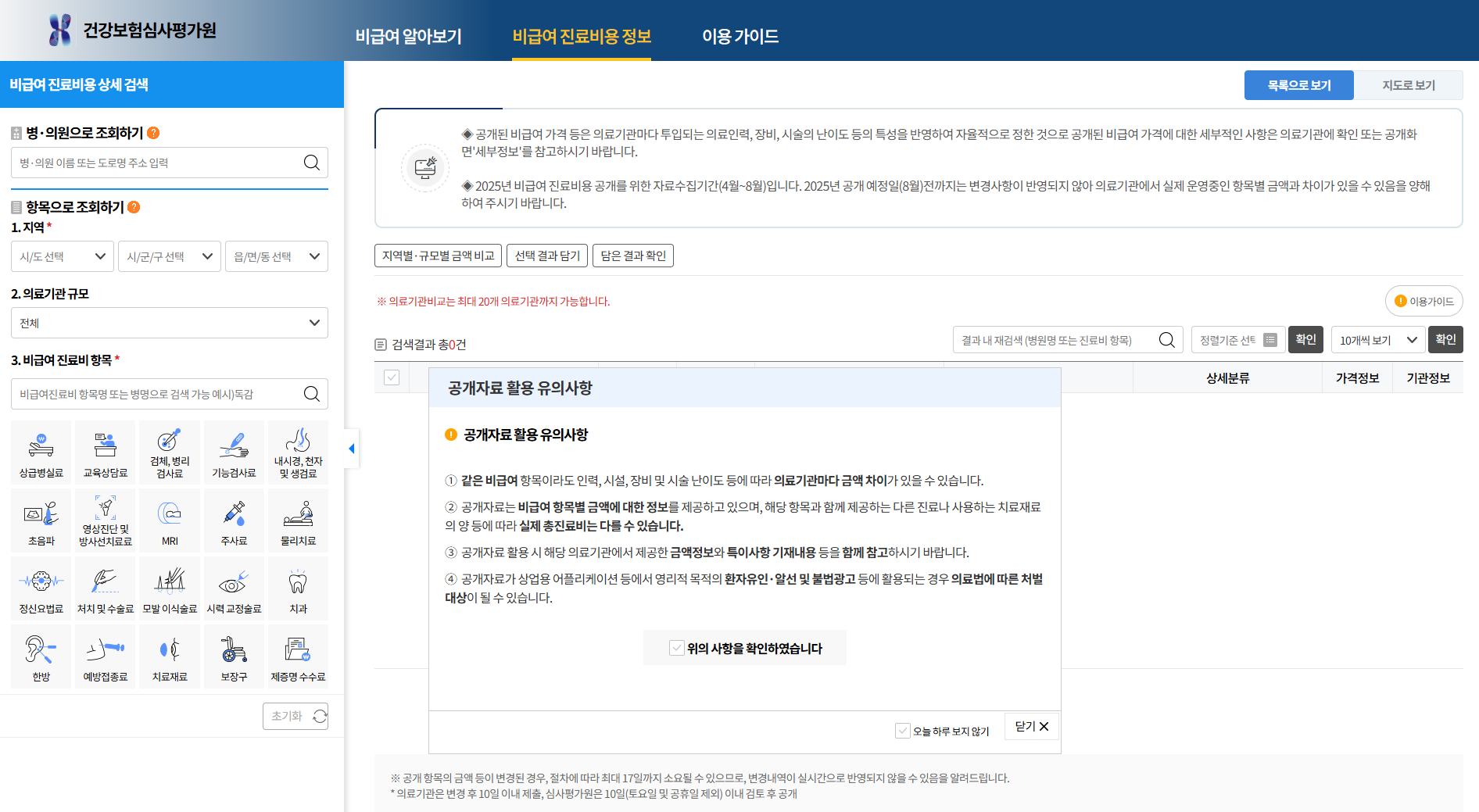 화면의 좌측 상단에 비급여 진료비용 정보를 클릭합니다.