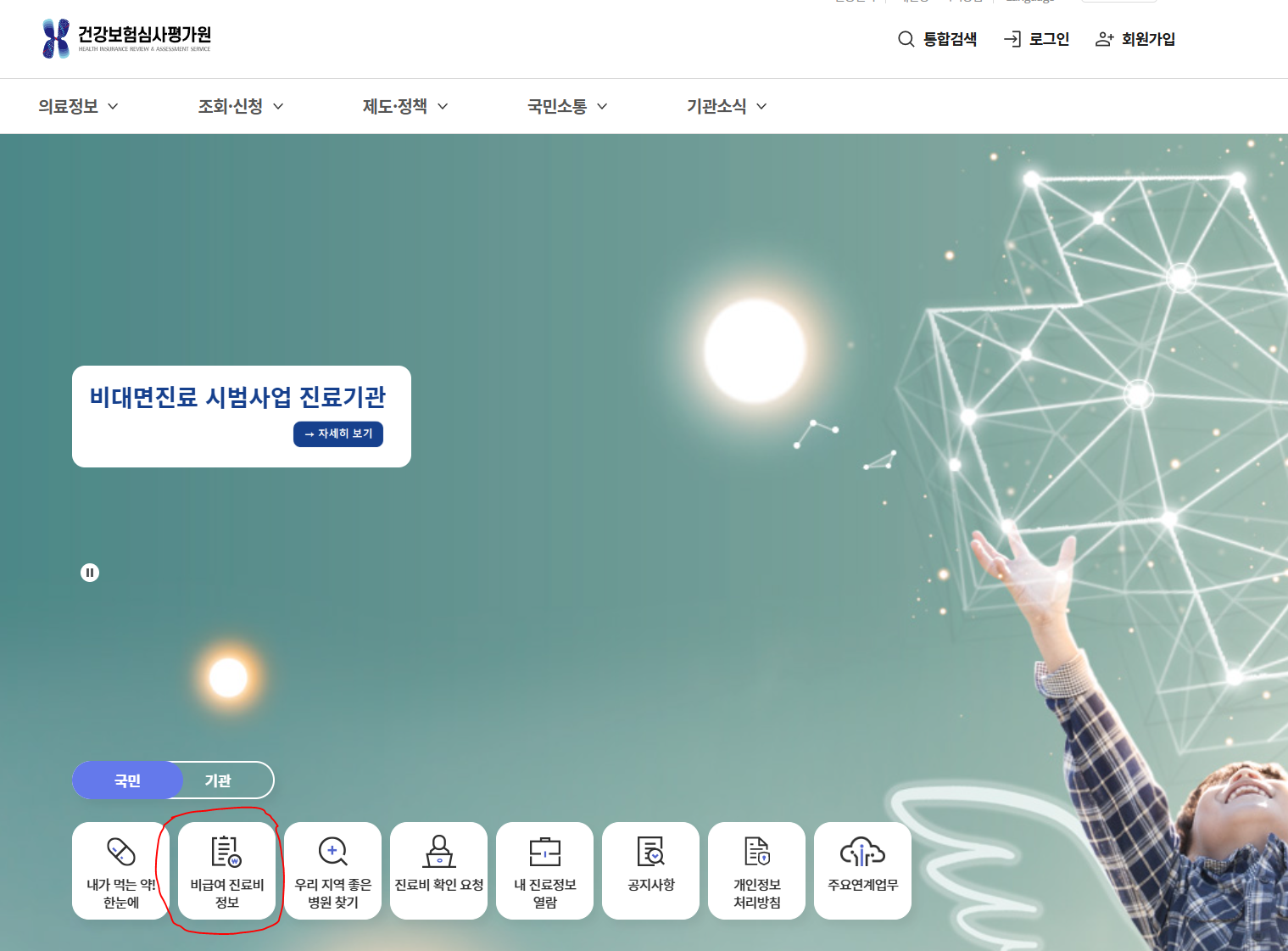 홈페이지 좌측 하단 비급여 진료비 정보를 클릭합니다.